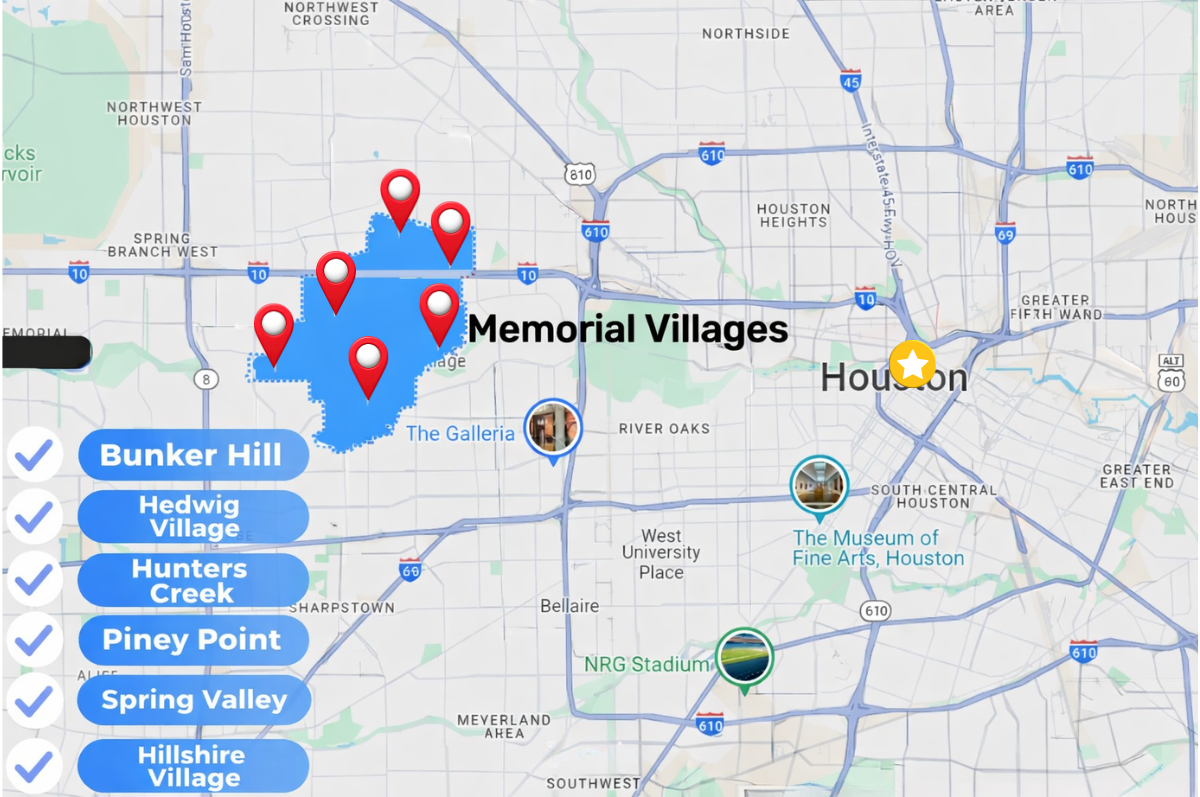 Memorial is located along the Memorial Drive and I-10 corridors in west Houston, between downtown and the Energy Corridor. The map above outlines the area and the individual villages that make up Memorial.
